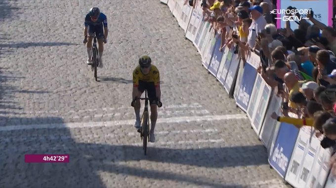 Todo volvía a estar junto a falta de 3 km, pero al comenzar la subida final hacia la línea de meta, los corredores empezaron a luchar por mantener la rueda. Romain Gregoire hizo su movimiento a 1400m para el final, y el ganador de la etapa 2 se unió a Per Strand Hagenes. El corredor de 19 años del Jumbo-Visma se hizo con la victoria.