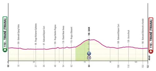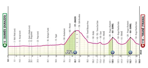 La corta distancia hará que cada segundo cuente en la lucha por la victoria de etapa, y en la capital albanesa se tomarán riesgos con tal de conquistar el triunfo o incluso el maillot rosa. No será un esfuerzo exclusivo en terreno plano, ya que los ciclistas ascenderán una pequeña colina donde se ubicará el punto intermedio, tras 8,1 kilómetros. Esa subida tiene 1,5 kilómetros al 4,9%, tras la cual se descenderá por la misma carretera a gran velocidad.