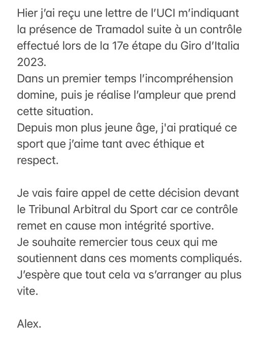 tramadol, en una respuesta el corredor francés dice que impugnará la decisión.