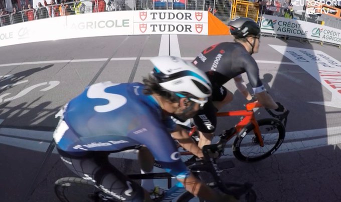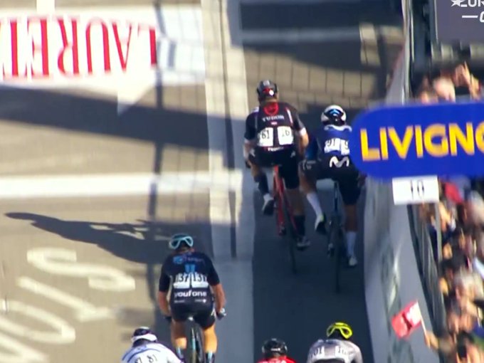 Fernando Gaviria, muy bien colocado también gracias al trabajo de Oier Lazkano en el último kilómetro, se colocó detrás suya, pero en vez de intentar adelantarlo por el exterior lo hizo por el interior y se quedó sin hueco para pasarle. Una pena, se le veía con mucha fuerza al corredor del