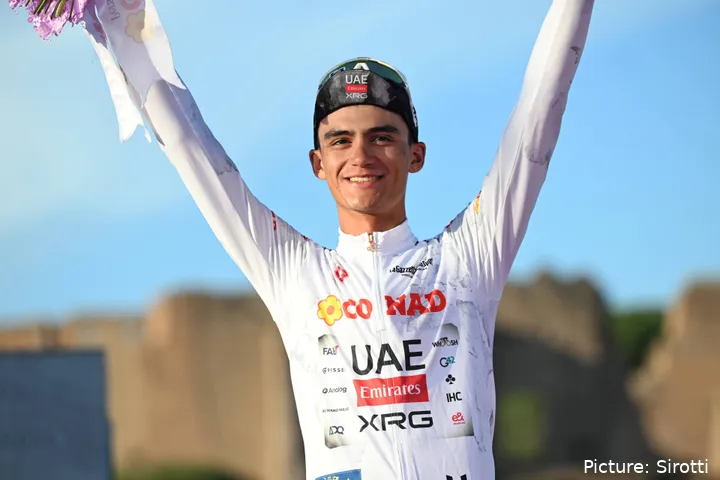 El mexicano fue una de las grandes estrellas del pasado Giro de Italia. De hecho, estuvo a punto de ganarlo cuando su rol inicial era de gregario de Juan Ayuso y Adam Yates. Su inexperencia y las malas decisiones del equipo emiratí provocaron que perdiese la general en el Colle delle Finistre, pero eso no manchó una Corsa Rosa mágica de Del Toro.