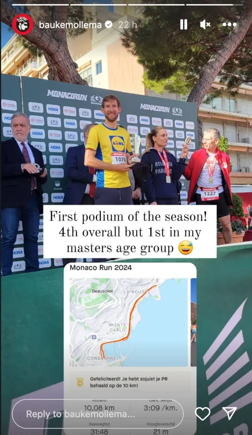 En su cuenta oficial de Instagram, Mollema reflexionó sobre sus esfuerzos. "¡Primer podio de la temporada!", subtitula una imagen suya sonriendo y sosteniendo un trofeo. "4º en la general pero 1º en mi grupo de edad masters".