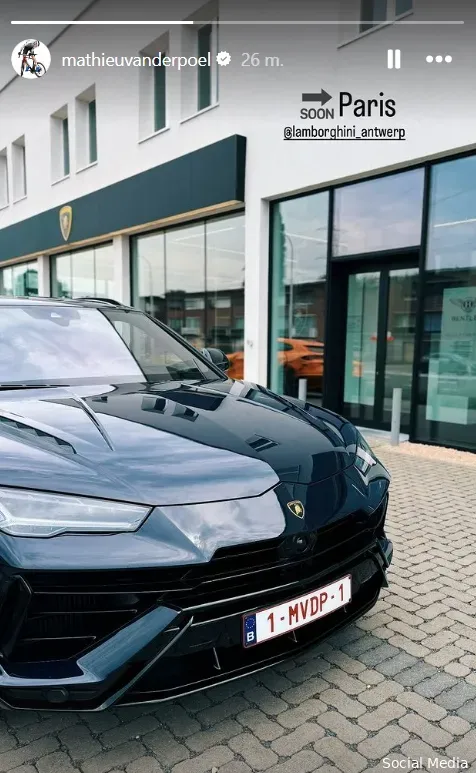 Uno de los patrocinadores de Van der Poel es el mundialmente conocido fabricante de supercoches Lamborghini, por lo que el corredor de 29 años aprovechó a la perfección su relación con la potencia automovilística italiana para tomar las carreteras de París en un Lamborghini impresionantemente elegante, con matrícula personalizada y todo.