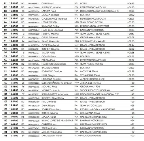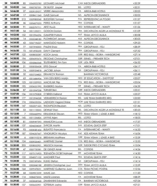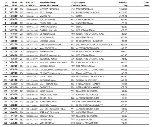 Fernando Gaviria, a las 14:11. El cierre de la jornada quedará en manos del líder de la carrera, Victor Langellotti, quien defenderá su maillot amarillo saliendo a las 16:15.