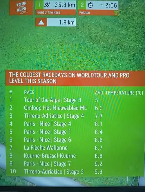 Tour de los Alpes de este miércoles pueden describirse como miserables. De hecho, son las peores condiciones del año hasta la fecha. Según un gráfico mostrado en pantalla, la temperatura media para los ciclistas hoy es de tan solo 5 grados centígrados, casi un grado y medio más fría que la que ostentaba el récord anterior para 2024, que era la Omloop Het Nieuwsblad.