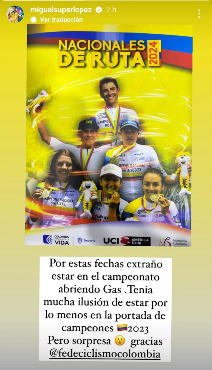 "Por estas fechas extraño estar en el campeonato abriendo gas. Tenía mucha ilusión de estar por lo menos en la potada de campeones 2023. Pero sorpresa, gracias Fedeciclismo".