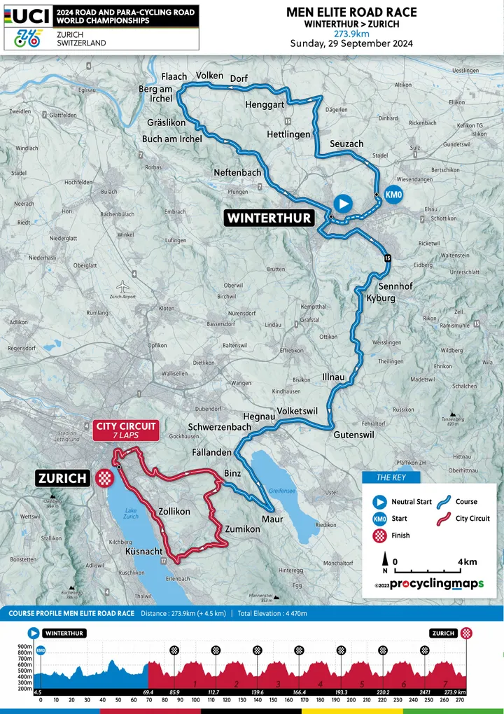 Este circuito deberá recorrerse completamente siete veces en la carrera masculina de élite, además de un primer bucle incompleto, sumando un total de 273,9 kilómetros. La salida se realizará en Winterthur e incluirá un tramo inicial en línea. Para la carrera femenina, el circuito se repetirá cuatro veces, también con un primer bucle incompleto, comenzando en Uster y cubriendo un total de 154,1 kilómetros.