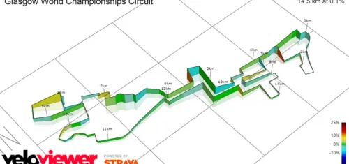 Al igual que en el Campeonato de Europa de 2018, será un recorrido extremadamente técnico en el que organizar una persecución es prácticamente imposible, y favorece enormemente las carreras de ataque desde el principio. La línea de meta estará frente a la emblemática George Square. El circuito tiene 14,5 kilómetros de longitud y nada menos que la increíble cifra de 44 curvas de unos 90 grados (o más).