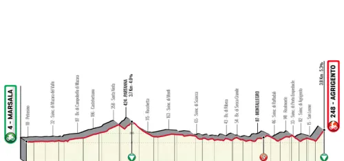 La primera etapa de la carrera será un comienzo interesante. Una etapa mayormente llana a través de la costa occidental de la isla, pero con un duro final. En Agrigento, los puncheurs y escaladores pasarán a primer plano. El final en la cima es de 3,8 kilómetros al 5,3%.