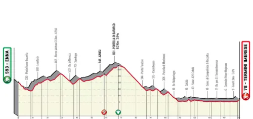 La etapa 3 es bastante similar. Más corta en distancia, los 150 kilómetros que separan Enna de Terimini Imerese comienzan con un tramo de pequeñas subidas que se pueden correr a gran velocidad. Luego sigue un descenso técnico en la costa norte de la isla tras 1100 metros de bajada. La última hora de carrera será en su mayor parte llana, pero los 1,3 kilómetros finales son extremadamente técnicos y rondan el 5%.