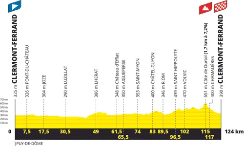 En esta edición, la Gran Salida tendrá lugar en Clermont-Ferrand, con una etapa completa que rodeará la ciudad del centro de Francia. Será una jornada de puertas abiertas, en la que las puncheurs y las esprinters tendrán la oportunidad de competir por el primer maillot amarillo. Hay una subida de 1,6 kilómetros al 7,6% antes de un final cuesta abajo en la ciudad.