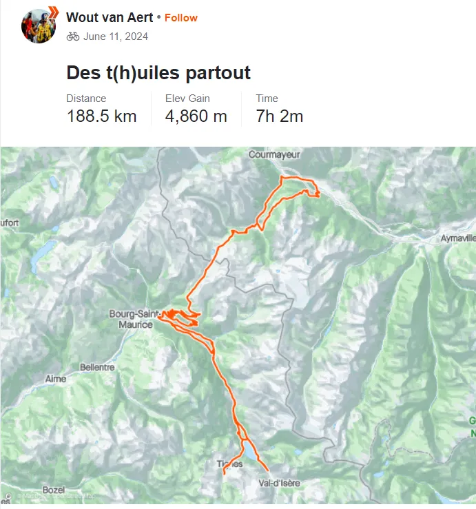 Actualmente en la altitud de Tignes, junto a otros ciclistas como Jonas Vingegaard y Christophe Laporte, van Aert ha dado la mejor señal de que está listo para regresar a una gran vuelta. Van Aert realizó un recorrido monstruoso de más de siete horas, con un total de 188,5 km y un desnivel de 4.860 metros.
