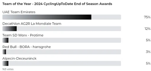 Esto también se notó en la votación, ya que el UAE Team Emirates se hizo con el 75% de los votos. El equipo Decathlon AG2R La Mondiale ocupó un distante segundo lugar con sólo el 12%, mientras que el equipo SD Worx - Protime (8%), Alpecin-Deceuninck (8%) y Red Bull - BORA - Hansgrohe (3%) se repartieron el resto de los votos.