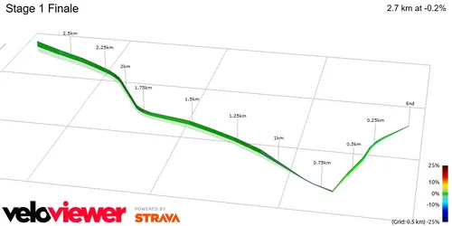 Así que hay un sprint intermedio en la cima de la pequeña subida final, de 1 kilómetro de longitud al 6,2%. Con un maillot amarillo y algunos segundos para repartir, algunos corredores querrán esto y potencialmente también intentarán continuar con el ataque/sprint. Esto ocurre cuando sólo faltan 9,5 kilómetros.