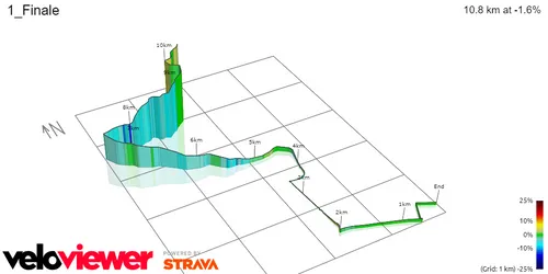 La subida alcanza su punto álgido a falta de 11 kilómetros y el pelotón se encuentra con unos cuantos kilómetros de descenso rápido. Los últimos 5 kilómetros ofrecen alguna posibilidad de que todo vuelva a juntarse para un pequeño esprint del pelotón, aunque son técnicos. El posicionamiento también será clave, ya que hay una curva de 90 grados justo en los últimos cientos de metros de la etapa.
