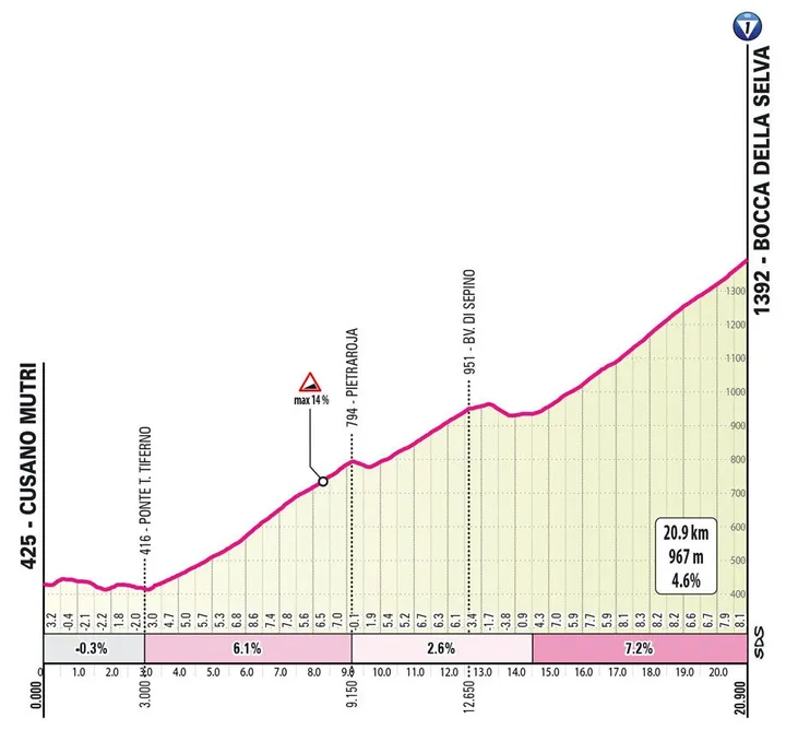 Cusano Mutri es la estrella del día, la subida es de 17,9 kilómetros al 5,6%. Pero no son constantes, esta media no representa la dificultad real de la subida. Su pendiente máxima del 14% está en sus primeros kilómetros, tenemos 6 kilómetros al 6% cerca de la salida. Sin embargo, no espere ataques aquí, ya que hay un pequeño tramo cuesta abajo entrando en la segunda mitad de la subida.