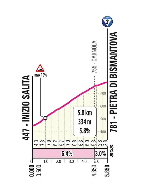 No es muy difícil, pero al final de un día tan difícil no será tan fácil como parece. 5,8 kilómetros al 5,8% y terminará a pocos kilómetros del final. La mayor parte de los 6 kilómetros finales que quedan de etapa son cuesta abajo y técnicos, pero hay una rampa cuesta arriba hasta la línea en la que aún podemos ver un emocionante sprint.