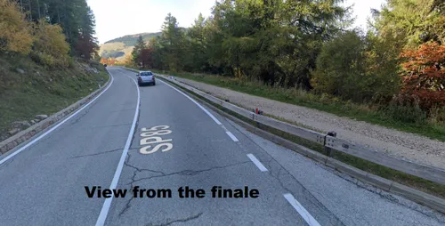 Esta subida es de 12,8 kilómetros al 8,2%, todo un Alpe d'Huez esencialmente, pero sólo la primera de cinco subidas. Esto termina a 123 kilómetros del final, y el Passo Bordala sigue rápidamente con 4,6 kilómetros al 7%. Sigue un descenso increíblemente técnico, pero la carrera debería calmarse después.