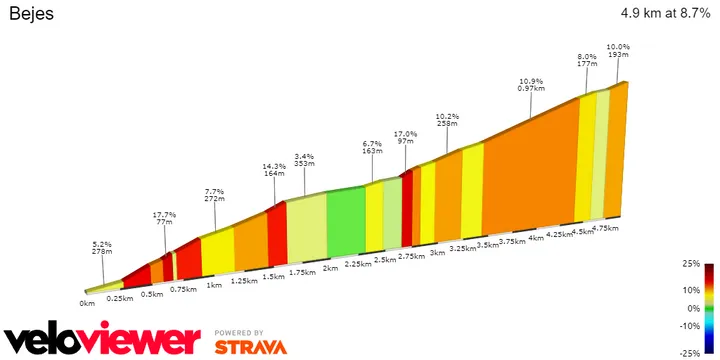 Un día realmente extraordinario por lo diferente que los organizadores diseñan las etapas. Este, el primer día de la semana final, está casi diseñado para ver vatios increíbles en el ascenso final. Cerca del mar, la carrera tiene 115 kilómetros que son ondulantes pero sin ningún ascenso significativo. Todo gira en torno a la ascensión final a Bejes el día .