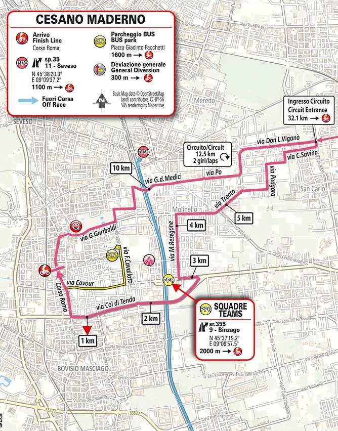 La subida final termina a falta de 56 kilómetros, y luego queda una hora de carrera hasta Cesano Maderno, cuando los ciclistas abandonan la región de los lagos y se dirigen hacia las afueras de Milán. El final no es demasiado técnico y es completamente llano.