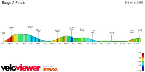 Jornada llana que se empieza a complicar al final. A falta de 30 kilómetros, el recorrido presenta una subida de 1,1 kilómetros al 9%, seguida por otra ascensión de características similares que culmina a 8 kilómetros de meta. En esta zona es muy probable que veamos ataques, ya que tras un descenso rápido se afronta una subida explosiva de 800 metros al 8%, cuya cima está apenas a 4 kilómetros del final. Será un tramo peligroso para los favoritos, ya que los movimientos ofensivos podrían prosperar ante la dificultad de organizar una persecución efectiva.