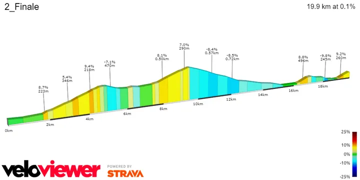 Pero el camino hacia la meta no es llano ni sencillo. Hay una pequeña cuesta que sube hasta el 8% y que termina a falta de unos 2 kilómetros. Luego, tras una curva cerrada, los corredores afrontan la última cuesta hacia la meta, que sólo tiene 800 metros de longitud pero una media del 7,7%. Un final interesante, en el que pueden pasar muchas cosas.