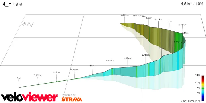 Sólo que esta vez la aproximación a la meta no es llana, sino muy rápida y cuesta abajo. A través de un descenso muy rápido y no técnico, el pelotón se encontrará corriendo a una velocidad extremadamente alta en los 750 metros finales, que serán llanos y directos hasta la línea de meta en lo que debería ser un espectacular sprint del pelotón.