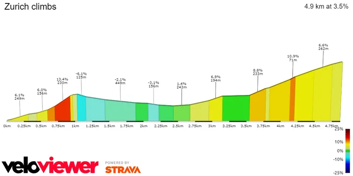 La subida principal es la de Witikon. Son 1,9 kilómetros al 6,2%, una subida no demasiado empinada y en la que las velocidades serán altas. Empieza un poco más empinada que la media y luego baja lentamente hasta la cima a falta de 20 kilómetros. Hay una larga curva, pero en general no es una subida técnica... Si alguien entra en esta subida en cabeza de carrera, no perderá demasiado tiempo.