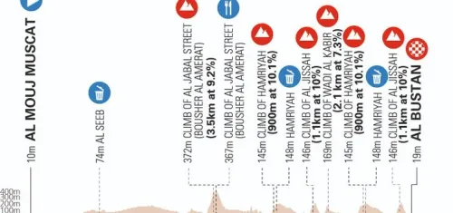 El recorrido, de 173,7 kilómetros, sigue carreteras familiares para los que han corrido el Tour de Omán. Consta de algunas de las subidas más populares de la carrera, que son cortas y empinadas. Es una clásica para los puncheurs y escaladores. La subida de Al Jissah tiene 1,1Km al 10% y la cima está a 4 kilómetros de meta, por los ataques decisivos llegarán allí, antes de un rápido final en bajada.