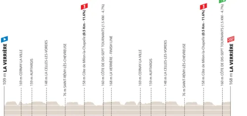 La etapa inaugural comenzará y terminará en La Verrière y será la primera oportunidad para que los velocistas ataquen. Sin embargo, no será un final incontestable ya que hay una rampa de 500 metros al 12% en la cima a sólo 6 kilómetros del final, pero aparte de ese bache no hay ningún otro lugar donde se puedan marcar diferencias y no debería ser una carrera demasiado complicada de controlar.