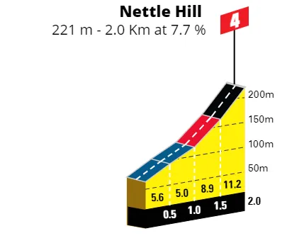 Será en Nettle Hill donde se juegue el desenlace de la etapa. No es una subida brutal, son 2 kilómetros al 7,7% y cima a falta de 22 kilómetros. Lo que sucederá aquí es una incógnita, pero como la carrera carece de una etapa reina, los ataques son muy viables aquí, tanto en la subida como justo después. Las rampas más duras llegan hacia el final, y lo que sigue es una meseta ondulada antes de un final que tiene muy poco de llano.