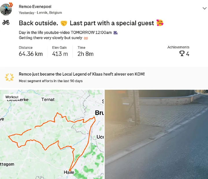 Después de todo, el doble campeón olímpico acaba de subir a Strava su primera salida al aire libre desde principios de diciembre, titulada "Back outside". Por supuesto, Evenepoel no está obligado a compartir públicamente todas las actividades de su cuenta de Strava, pero por lo que se puede entender de su pasado, este debería ser su primer entrenamiento en las carreteras cercanas a Bruselas en un tiempo, ya que escribe "Llegando muy despacio, pero seguro".