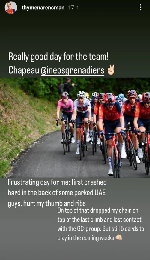 "Un día frustrante para mí", reveló el ganador de etapa de la Vuelta a España, de 23 años, en sus redes sociales. "Primero choqué contra la parte trasera de algunos chicos del UAE Team Emirates. Me lastimé el pulgar y las costillas".