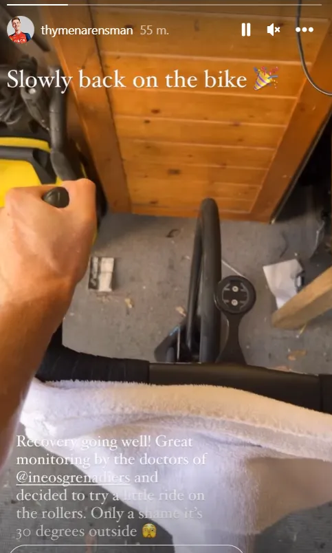 10 días después de ser trasladado en ambulancia a un hospital español y sólo seis días después de someterse a una operación dental de urgencia, el holandés ha vuelto a subirse a la bicicleta. "¡La recuperación va bien!" escribe Arensman en una actualización en su historia de Instagram. "Gran seguimiento por parte de los médicos del INEOS Grenadiers y decidí probar un pequeño paseo en los rodillos. Una pena que haga 30 grados fuera".