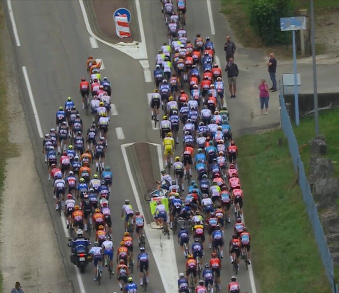 🇫🇷 #TDF2024 Pequeño susto, sin aparentes consecuencias, para @muehlberger_94 y @Nelsoliveira89, al producirse un tapón en el peloton con una isleta. Menos de 60 km a meta; ambos ya de nuevo en marcha.
