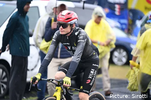 Visma - Lease a Bike aprovechó que la carrera explotó en los repechos finales para atacar a 5 km de meta. Sin embargo, su aceleración fue muy breve, y de hecho la aprovecharon Matteo Jorgenson y Kevin Vauquelin para intentar irse cara a cara.