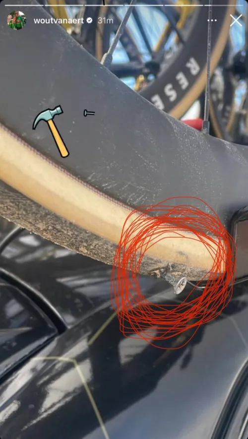 Visma - Lease a Bike ha tomado su cuenta oficial de Instagram para mostrar la prueba a través de su historia. Aunque parece un tornillo en lugar de un clavo, ciertamente no se ve bien. Compruébalo tú mismo a continuación.
