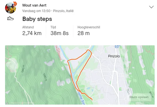 Van Aert ha subido un recorrido de 2,7 km realizado a pie en la región italiana de Trento, que le llevó 38 minutos. Un viaje tranquilo, tal vez, pero para alguien a quien se ha visto con muletas muy recientemente, la caminata es un signo seguro de los pequeños pasos que se están dando hacia la recuperación.
