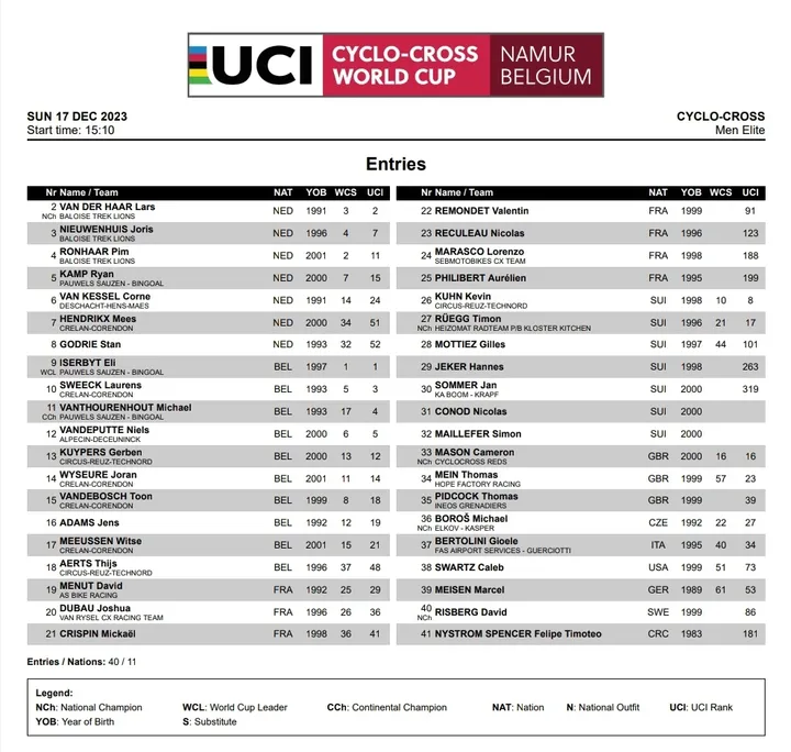 Lista de participantes de la Copa del Mundo de ciclocross de Namur femenina con Van Empel, Alvarado, Pieterse, Brand, Backstedt y Van Anrooij