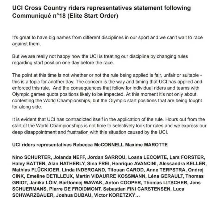 La comunidad del ciclismo de montaña criticó duramente estas decisiones absurdas que favorecían claramente a los tres corredores. También se emitió un comunicado conjunto de muchos atletas, poniendo en el punto de mira el injusto trato que reciben corredores que compiten todo el año en la disciplina y que buscaban resultados o puntos UCI respectivamente. Pidcock, aunque no lo solicitó, naturalmente también recibió reacciones negativas, ya que se benefició de la norma y acabó compitiendo por la victoria. Busca distanciarse en la medida de lo posible de la decisión.