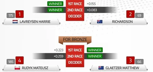 El holandés conquistó las franjas arco iris tras un sprint contra Matthew Richardson, medalla de plata. De la lucha por la tercera posición y último escalón del podio salió victorioso su compatriota Matthew Glaetzer.