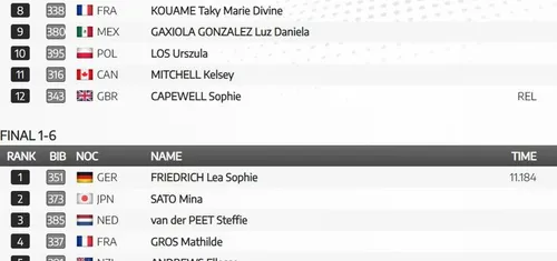 En la final, Friedrich se enfrentó a las 6 mejores corredoras de las rondas clasificatorias. La alemana se impuso a Mina Sato y Steffie van der Peet, quienes completaron el podio.